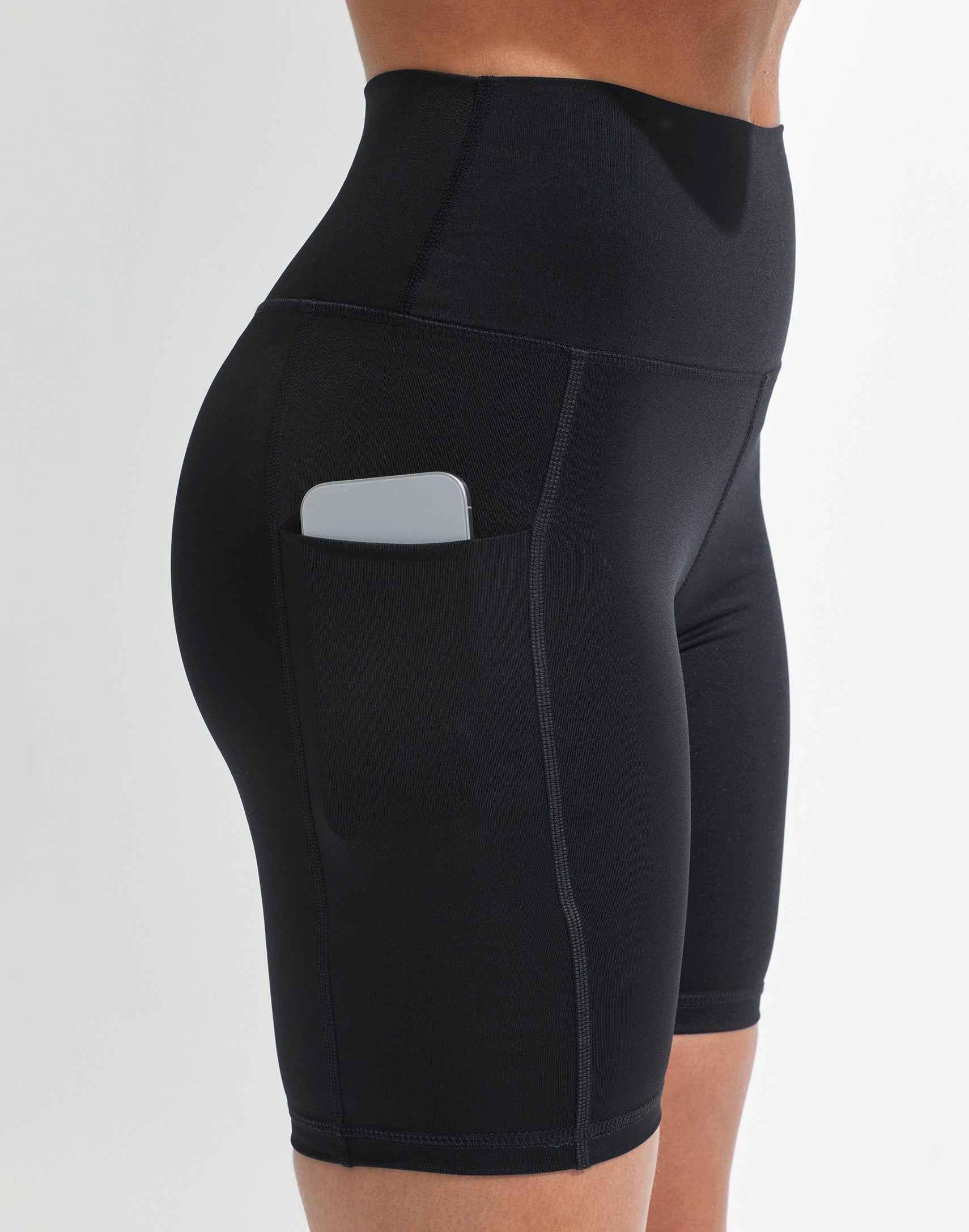 Soft, stretchy, and with a deep waistband, these mid-thigh performance legging shorts feature pockets on both legs and go with everything.